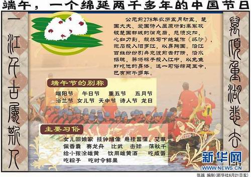 端午節(jié)是我國漢族人民的傳統(tǒng)節(jié)日,這一天必不可少的活動逐漸演變?yōu)槌贼兆樱慅堉,掛菖?SPAN lang=EN-US>`蒿草、艾葉,薰蒼術、白芷,喝雄黃酒。據(jù)說,吃粽子和賽龍舟,是為了紀念屈原,所以解放后曾把端午節(jié)定名為“詩人節(jié)”,以紀念屈原。至于掛菖蒲、艾葉,薰蒼術、白芷,喝雄黃酒,則據(jù)說是為了避邪。