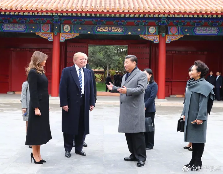 特朗普使用平板電腦向習近平夫婦展示外孫女阿拉貝拉用中文演唱歌曲、背《三字經(jīng)》和古詩的視頻。習近平夸獎阿拉貝拉中文水平進步,說可以打“A+”,表示她在中國已成為小明星,希望她也能有機會來中國。 兩國元首夫婦經(jīng)內(nèi)金水橋,穿過太和門,在恢宏莊重的太和殿廣場合影。隨后沿故宮中軸線,依次參觀了太和殿、中和殿、保和殿。習近平沿途向特朗普介紹故宮的歷史、建筑和文化,特朗普頻頻贊嘆。