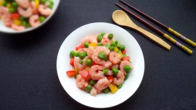 原料:蝦仁4只,嫩豌豆50克,雞湯、鹽、水淀粉、香油各適量;